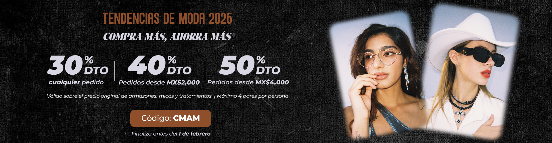• 30% de descuento en cualquier monto; 40% de descuento desde $2,000 MXN; 50% de descuento desde $4,000 MXN. Máximo 4 pares por persona.