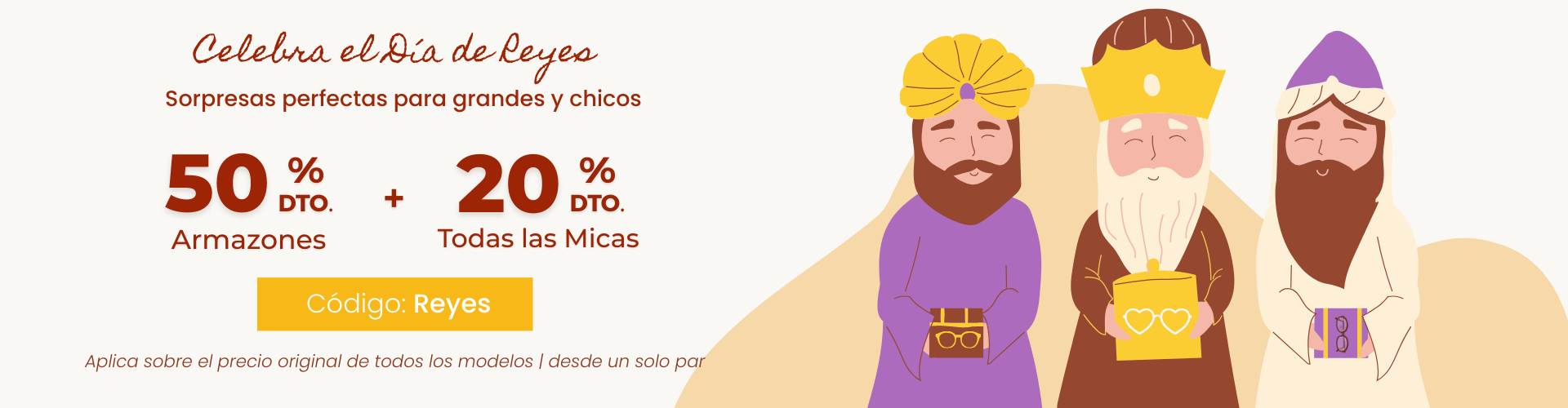 Esta oferta es aplicable sobre el precio original de todos los modelos, se aplica un descuento del 50% en armazón y 20% en todas las micas y traitamientos.